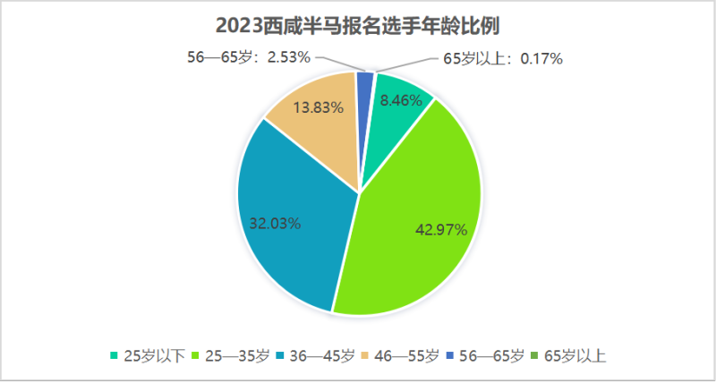本次赛事报名选手年龄覆盖各年龄段,25岁以下选手占比8.46%;25—35岁选手占比42.97%;36—45岁选手占比32.03%;46—55岁选手占比13.83%;56—65岁选手占比2.53%;65岁以上选手占比0.17%。可见本次赛事中,25—35岁的选手为参赛主力军!