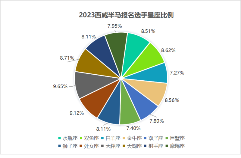 从星座来看,“天秤座”选手报名占比最多,“白羊座”选手报名占比最少。不过,无论你是哪个星座,都祝你都能在本次比赛中跑出好成绩!