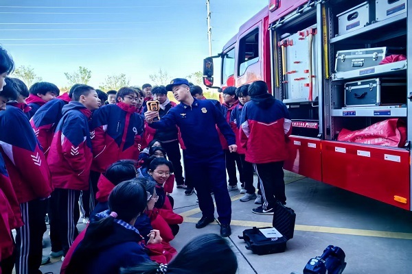 在科普教育基地,宣传人员采取现场讲授、互动问答、操作演示等形式,分批次带领师生体验VR虚拟灭火模拟、消防体感游戏、VR蛋椅体验系统、火灾隐患学习系统、烟雾传播演示模型、厨房实景火灾隐患查找系统、传感器智能消火栓使用训练系统等趣味项目,并结合不同的模拟场景,为师生讲解火灾的危害性、预防措施以及火场如何正确逃生自救等消防安全知识。随后,消防员带领师生观看消防车辆装备区,师生们详细了解了云梯消防车的功能以及破拆工具、救生器材的操作原理与实战用途,最后,师生们走进战斗班,亲身体验“火焰蓝”日常。