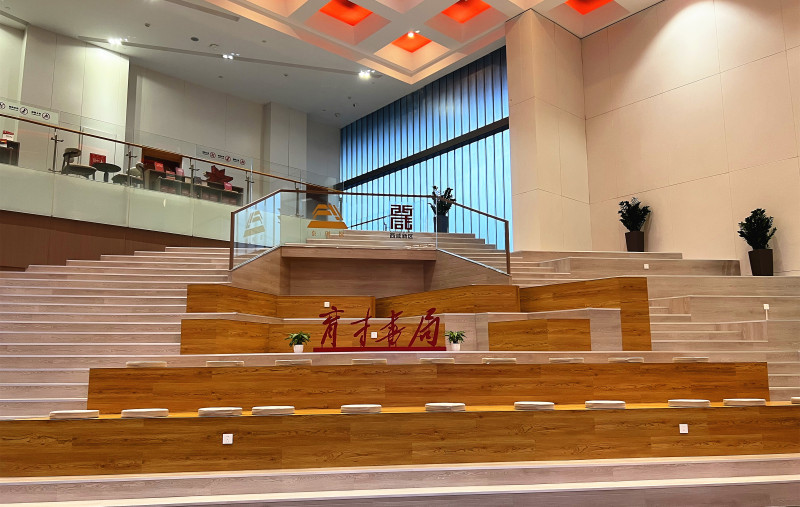 是一处巧妙融入秦创原logo的秦创原阶梯书廊,可组织百人规模的学术研讨、沙龙、阅读分享、红色观影等活动。