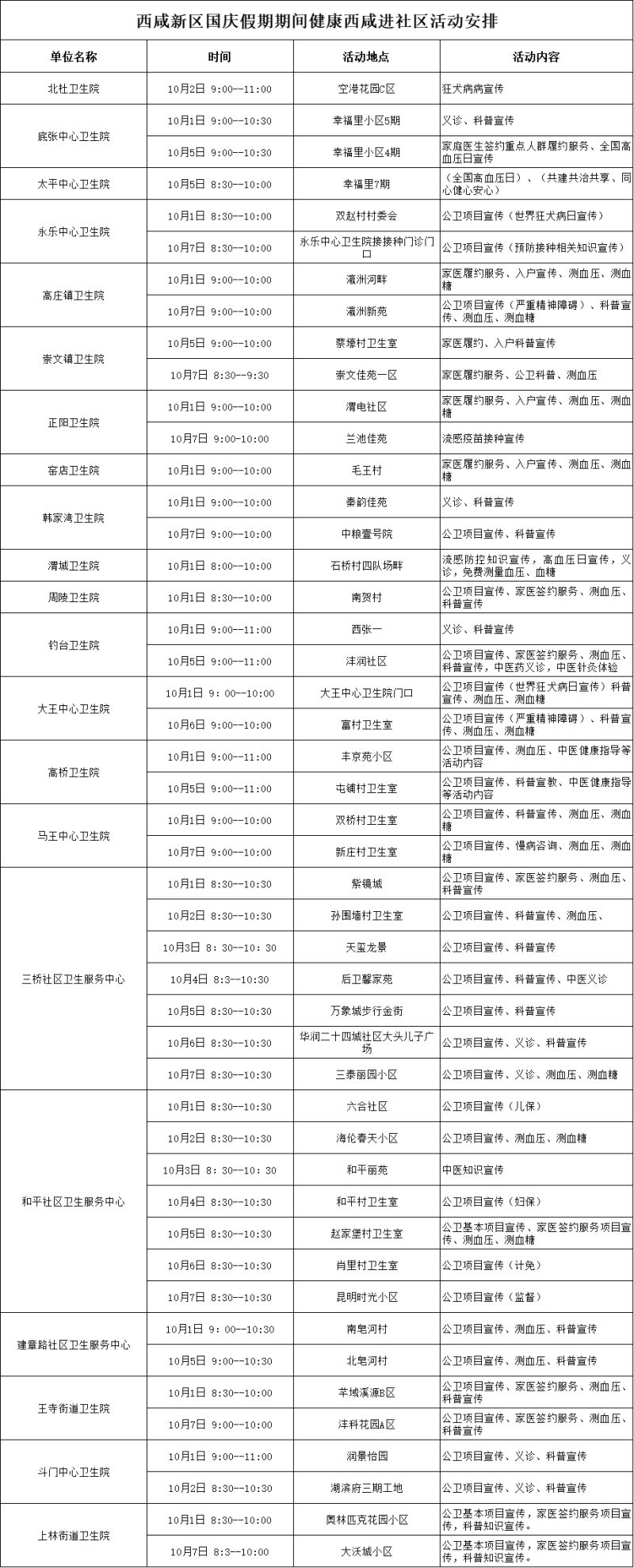 为全面守护辖区群众健康安全,国庆节假日期间,新区开展“健康西咸进社区”活动,将服务送到群众家门口,同时,疫苗接种工作“不打烊”,最全健康服务信息快来收藏。