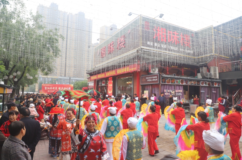 五十桌流水席上,酱龙骨、常德酱香鸭、陕西墩子汤、臊子面等家常菜,以及甜而不腻的重阳糕、暖胃豆浆,均贴合老人饮食需求。75岁的李阿姨称赞:“臊子面好吃,服务也贴心,像回自己家一样。”席间,沣河森林公园秧歌队、奥园秦腔团等群众文艺团队带来的秦腔与歌舞表演,更让现场欢声笑语不断。
