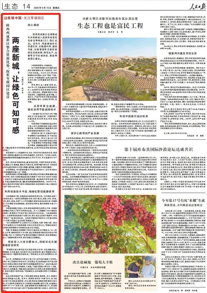 今天,人民日报刊发《两座新城,让绿色可知可感》,关注西咸新区整合资源优势,探索零碳园区建设,全力推动发展方式绿色低碳转型的创新探索和实践成效。