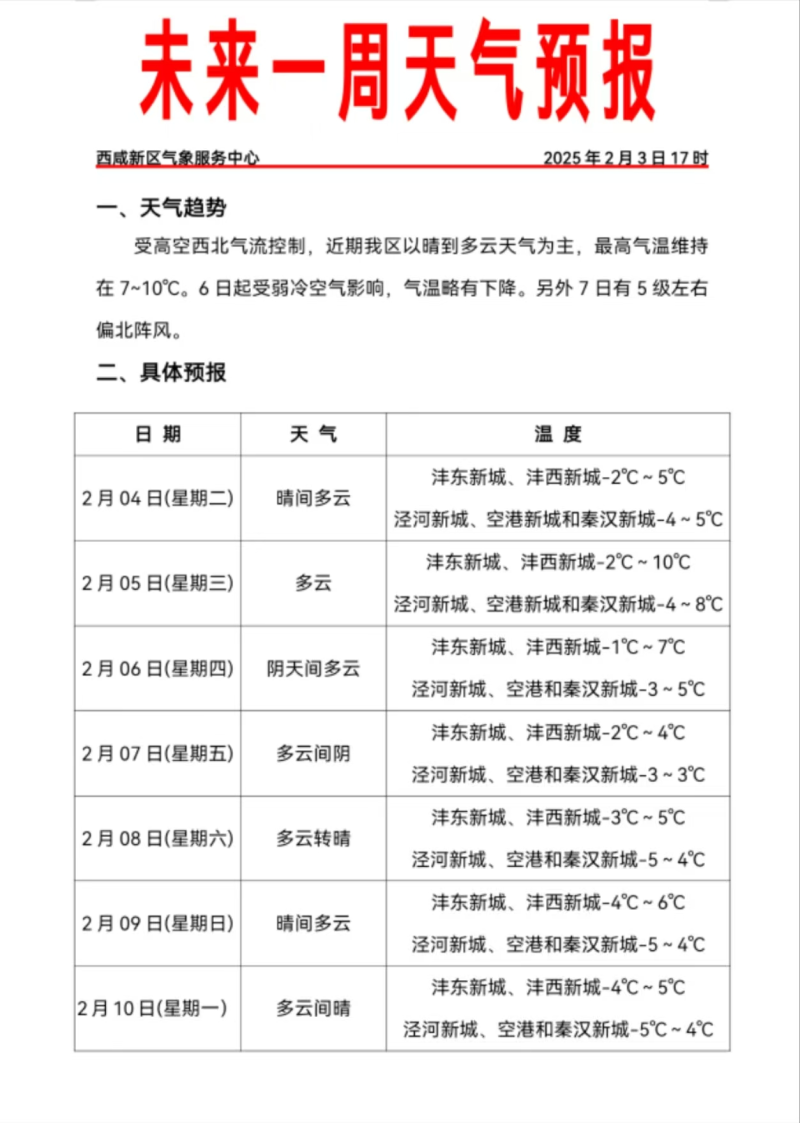 今天:晴间多云,沣东新城、沣西新城-2℃~5℃,泾河新城、空港新城和秦汉新城-4℃~5℃。