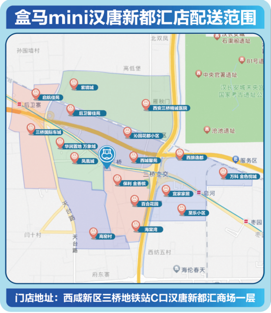 西咸新区盒马门店位于三桥地铁站C口汉唐新都汇商场一层,占地面积近1200平方米,主要销售生鲜果蔬、乳品烘焙、海鲜水产等近2000种商品,此外还有鲜花、日用品等居家生活用品,全面满足周边居民日常生活需求。