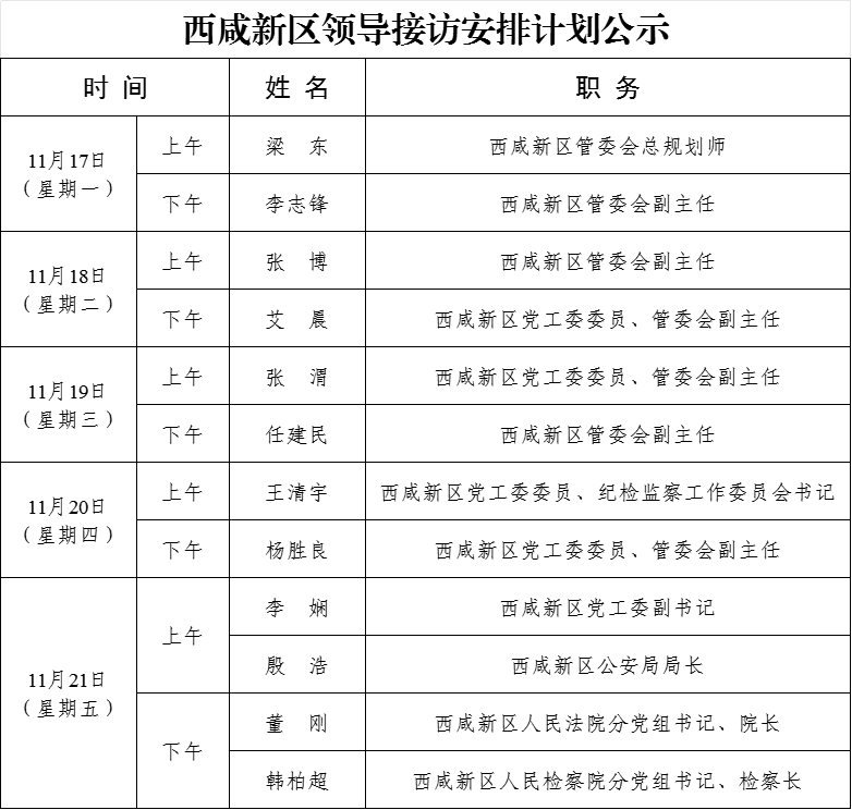 为进一步畅通信访渠道,方便群众及时就地反映诉求、解决问题,现将11月17日-11月21日西咸新区领导接访安排计划公示如下: