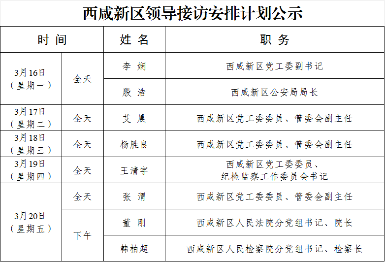 为进一步畅通信访渠道,方便群众及时就地反映诉求、解决问题,现将2026年3月16日-2026年3月20日西咸新区领导接访安排计划公示如下: