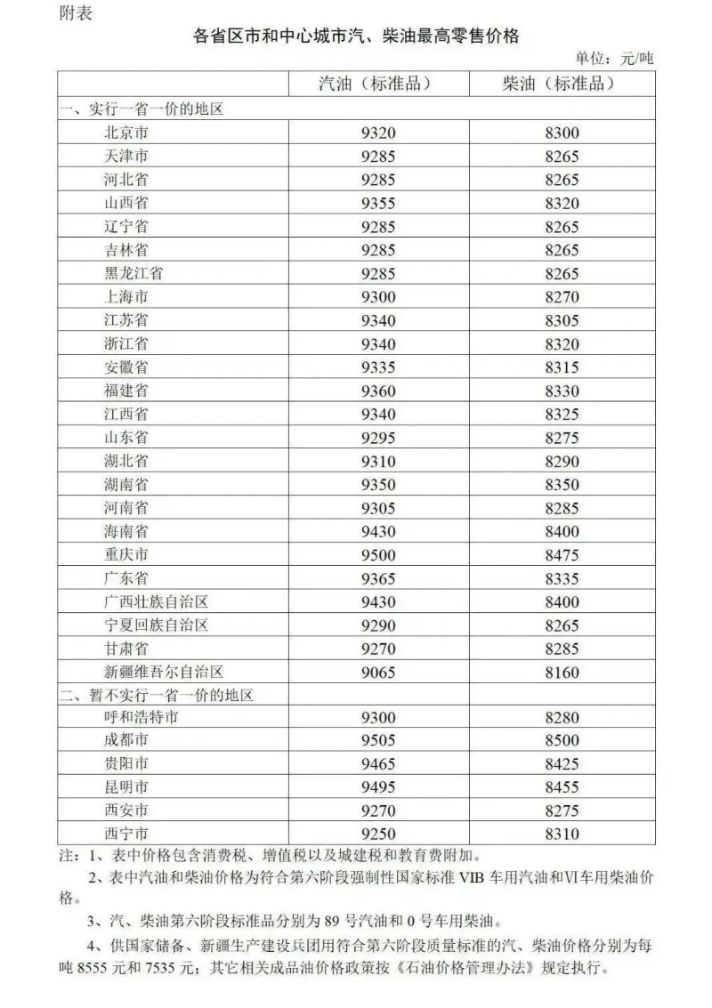 根据近期国际市场油价变化情况,按照现行成品油价格形成机制,自2023年6月13日24时起,国内汽、柴油价格(标准品,下同)每吨分别降低55元和50元。调整后,各省(区、市)和中心城市汽、柴油最高零售价格见附表。相关价格联动及补贴政策按现行规定执行。
