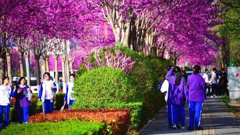 青春感机位:以校园学子穿行花间为背景,或是在花廊下骑行,定格青春与繁花相映的画面。