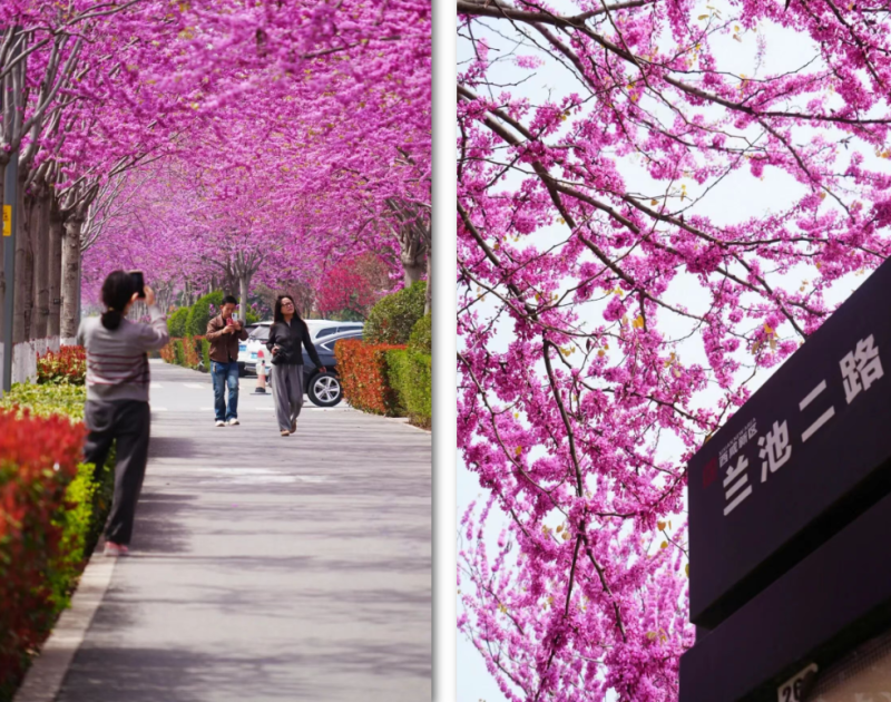 沿着兰池二路一路前行,道路两侧的紫荆树沿步道整齐排列,粗壮的枝干上缀满密匝匝的花簇,形成一条一眼望不到头的紫色穹顶。搭配两侧错落排布的景观绿篱,仿佛闯入了童话里的紫色隧道。