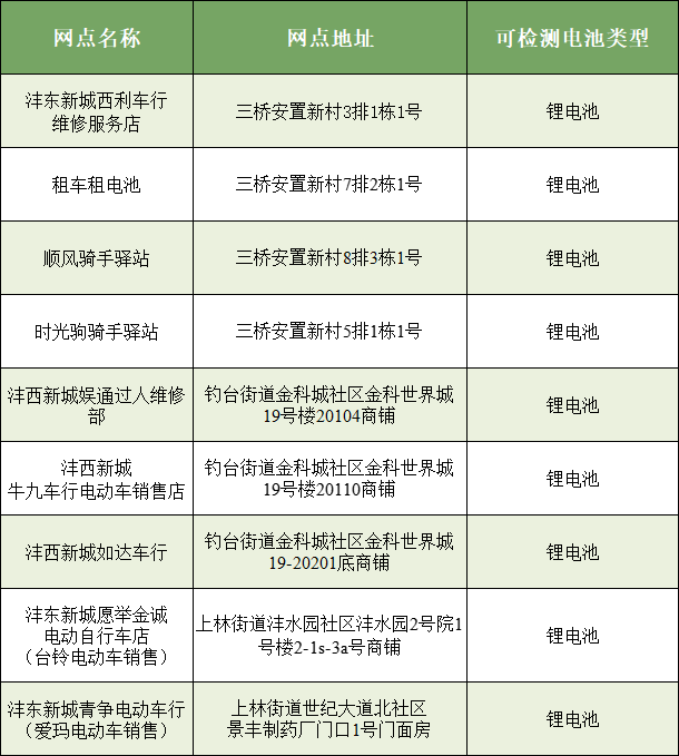 电动自行车电池老化、续航衰减、鼓包漏液等问题,是引发火灾等安全事故的重要隐患,也是电动自行车全链条整治行动中风险防控的关键环节。以下公示的健康检测评估网点,可为锂电池、铅酸电池提供健康检测服务,助力居民及时排查电池安全隐患,从源头防范安全事故发生。