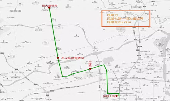 该线路由恒大童世界出发,途径秦汉大道、朱宏路、草滩八路等至凤城七路。全程约27km,设置恒大童世界、秦汉新城管委会、尚稷路、凤城七路等4处停靠站点。配备10米级纯电动清洁能源客车2台。