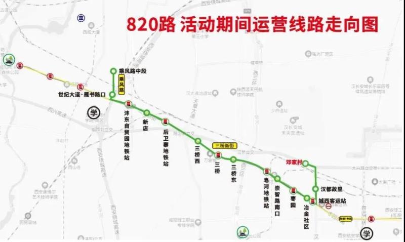 线路走向:820路原线路由西咸大厦至邓家村,活动期间该线路仅运营乘风路中段至邓家村段。