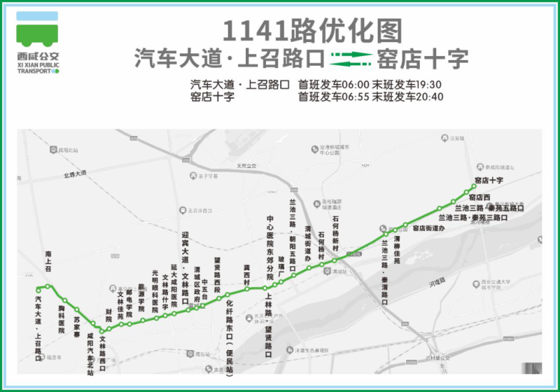 线路从渭柳佳苑沿兰池三路西段延伸至窑店十字,新增文林路西口(单边站)、上林路·望贤路口、兰池三路·秦苑三路口、兰池三路·秦苑五路口、窑店西、窑店十字6个站点,取消原秦苑一路·兰槐路口站。剩余原线路走向不变。