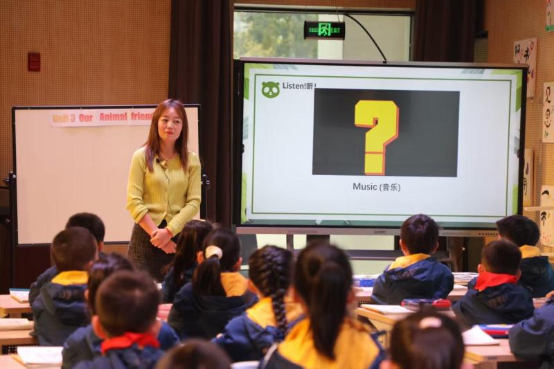 活动伊始,西咸新区沣西文教园第一小学教育集团总校长刘鲁宾致欢迎词。随后,示范课环节,陕西省教学能手、西安未央凤凰城小学何琳琳老师以四年级《Unit 2 My friends C Reading time》为载体,构建“文本精读-思维拓展-情感共鸣”高段教学范式,融入AI动画、小组合作等多元形式,让英语学习源于文本、扎根生活。陕西省基础教育学科带头人、西安育英小学薛娟老师针对低段学生特点,带来三年级《Unit 3 Our animal friends》示范课,通过多媒体动画、互动游戏等形式,将词汇句型与中华优秀传统文化结合,实现“玩中学、用中练”,渗透保护动物价值观。两场示范课为参会教师提供了可复制的教学范例。